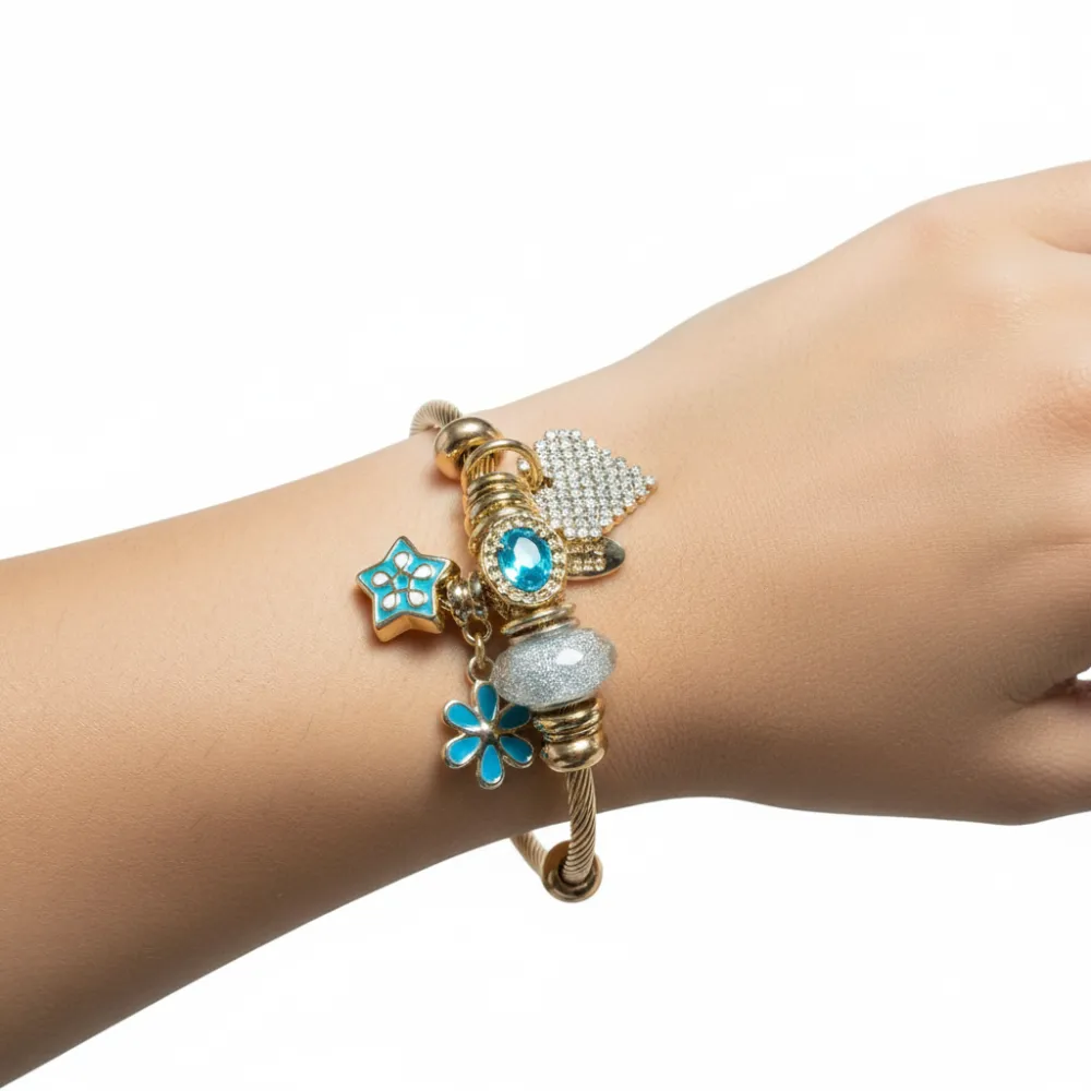 Mavi Taşlı Yıldız ve Kalp Charm Bileklik