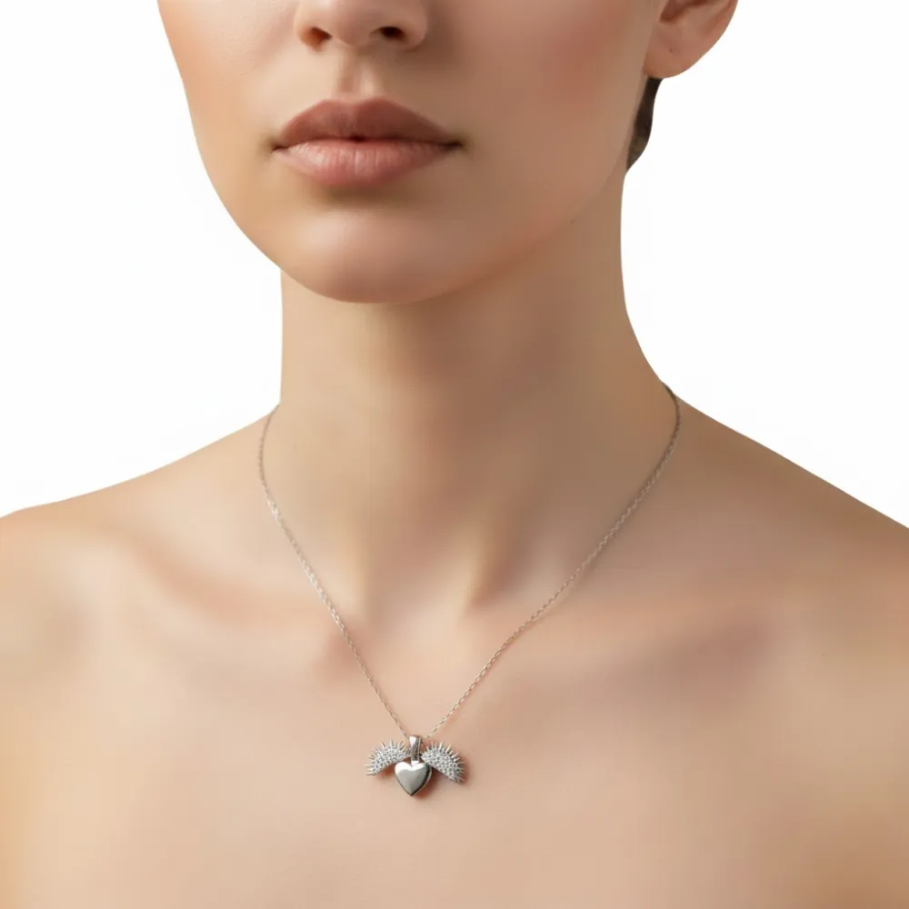 Taşlı Kanatlı Kalp Gümüş Renk Kolye